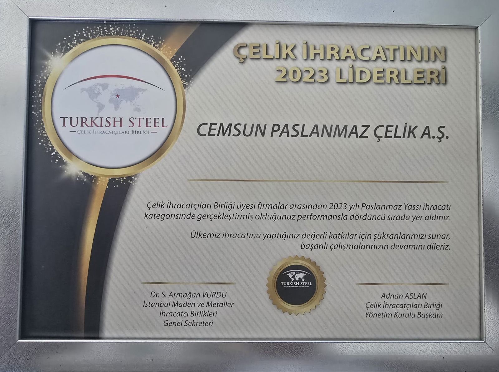 We are glad to inform you that our company awarded number 4 to export stainless steel in Turkey by Turkish Steel Exporters’ Association.